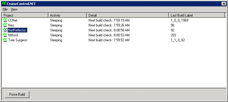 • Force build Wakes the CruiseControl.NET server from its sleep and tells it to start building immediately.